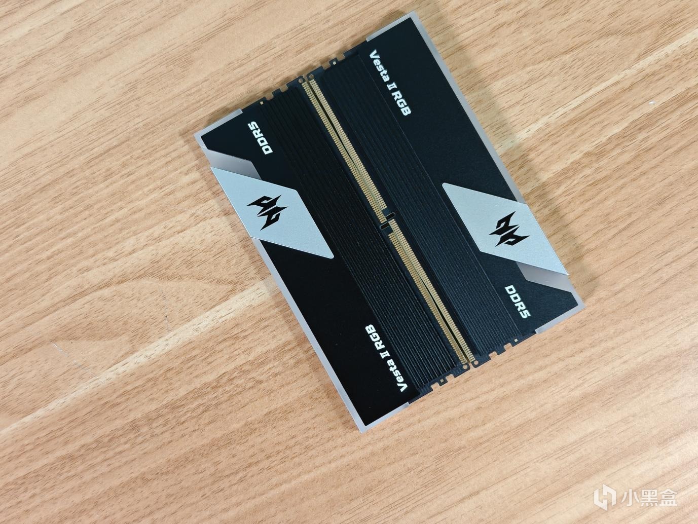 內存是宏碁掠奪者Vesta II 炫光星艦RGB燈條,內存條側面是黑色的金屬馬甲,棱形的銀色部分是掠奪者的標記。左側寫着Vesta II RGB,右側是DDR5,側面是強化的凝霜鋁合金散熱馬甲,2mm厚度,採用了斜體凹槽設計,可以提高冷熱對流效率,實現高效散熱。內置溫度傳感器,支持實時監控溫度,確保內存有效安全可靠地運行。宏碁掠奪者Vesta II內存顆粒具有ECC糾錯機制,可以自行偵測、修整數據錯誤,高頻率運行信號的完整性更加有保證,超頻更加穩定。內存內置PMIC電源管理芯片,實現更加穩定的電源管理,提高系統運行的穩定度。