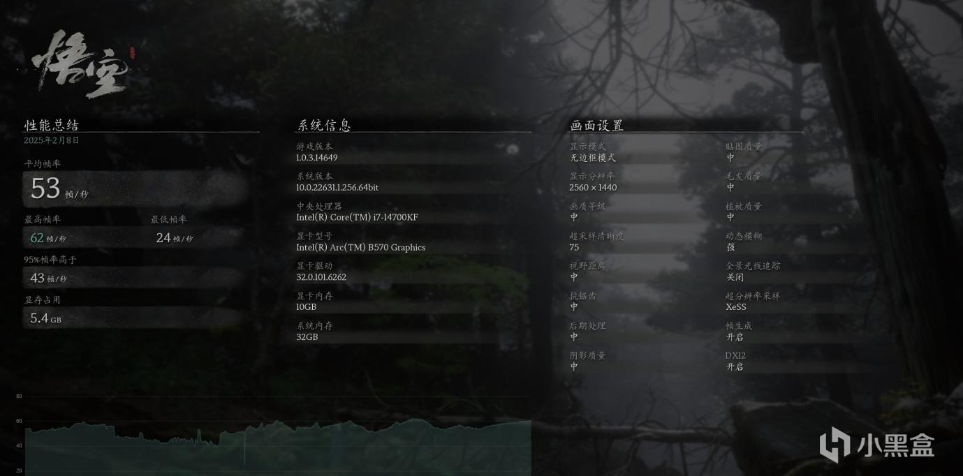 開啓XeSS,幀數53幀/秒。XeSS同FSR的原理不同,XeSS屬於AI,它的畫質要好於FSR。