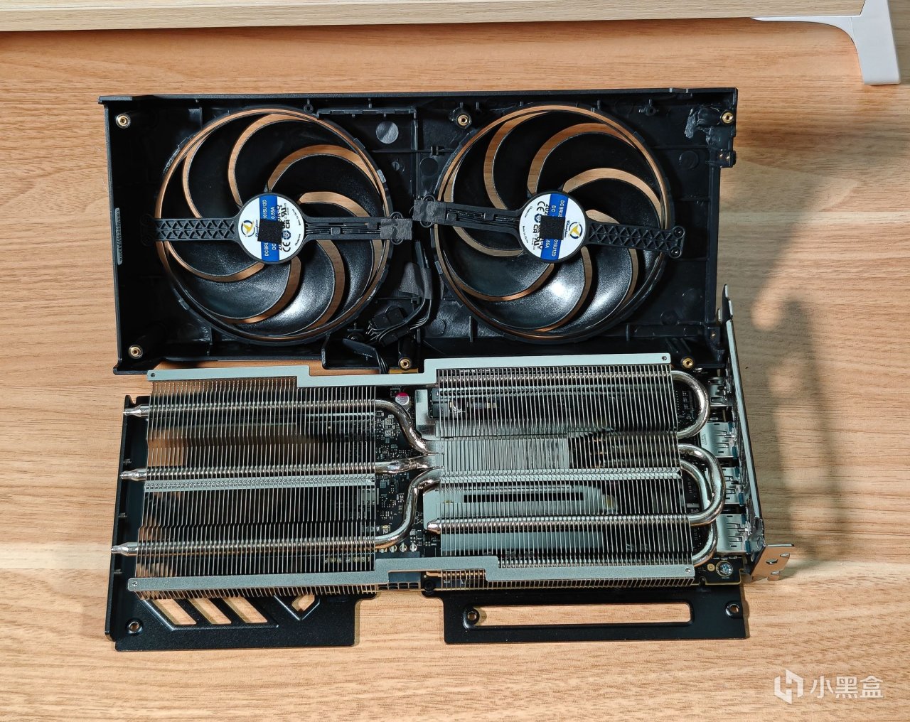 風扇框架只需擰鬆螺絲就可拆下,方便清理風扇。可以看見散熱鰭片下面有3根鍍鎳熱管。風扇+熱管+背板,形成了完成的散熱設計,可以確保顯卡散熱效果,稱爲Dual-Force散熱系統。