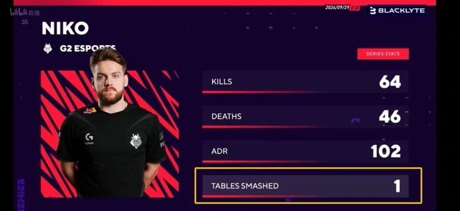 出處:意爲“擊殺桌子1張”,在24年9月份的CSGO BLAST秋季總決賽半決賽G2和VIT的比賽中,圖三關鍵局niko淘汰對面四人卻在最終1V1中痛失回合,隨後他一拳砸穿了現場的專業電競桌來發泄自己的懊惱情緒。賽後賽事方看熱鬧不嫌事大,在niko的結算畫面上加上了充滿節目效果的:擊殺桌子1張,並把砸碎的桌子送給了niko作爲紀念。除了笑料,這個梗主要用來調侃取得了常規邏輯之外的成績。