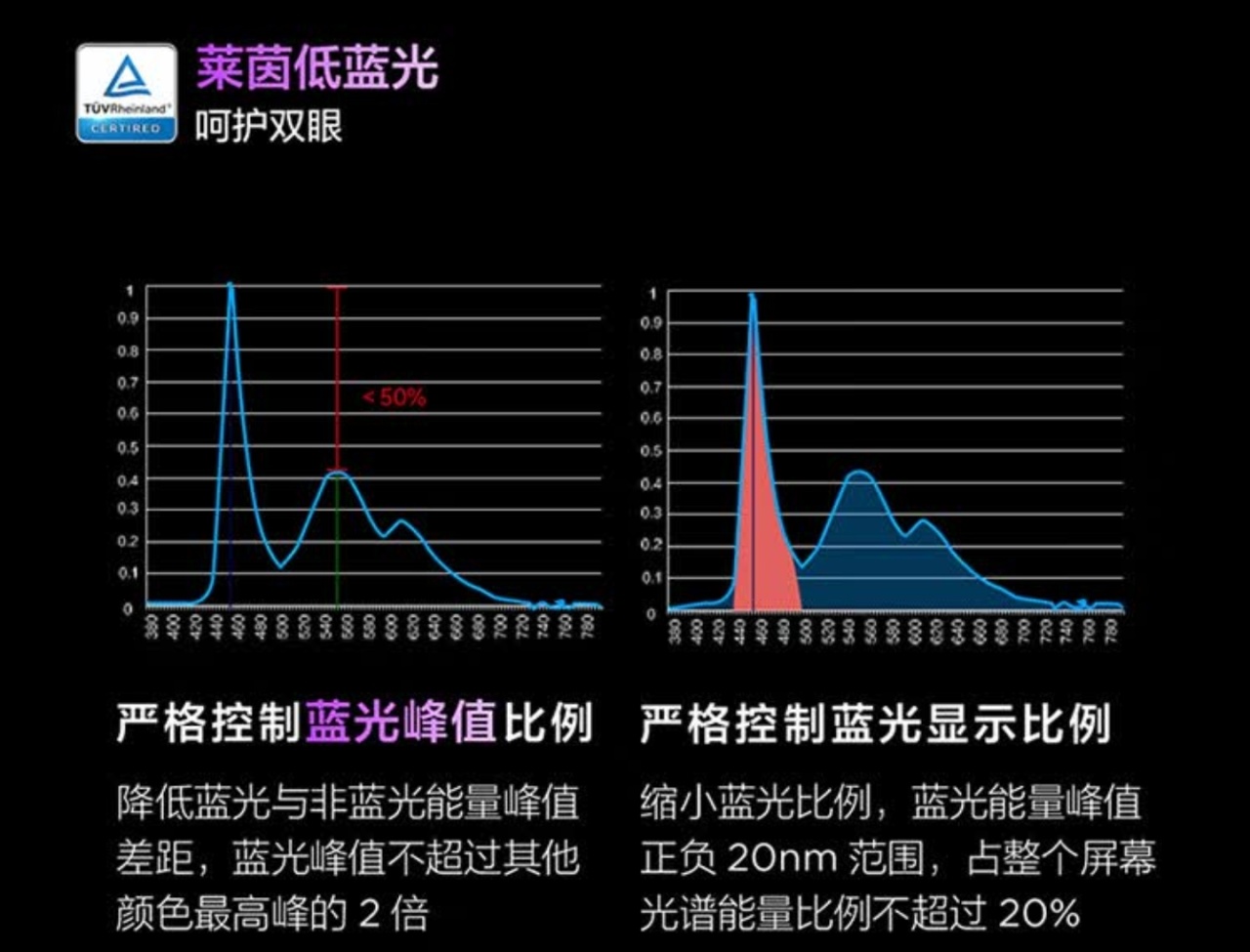 護眼方面,支持萊茵認證低藍光技術,有效護眼。