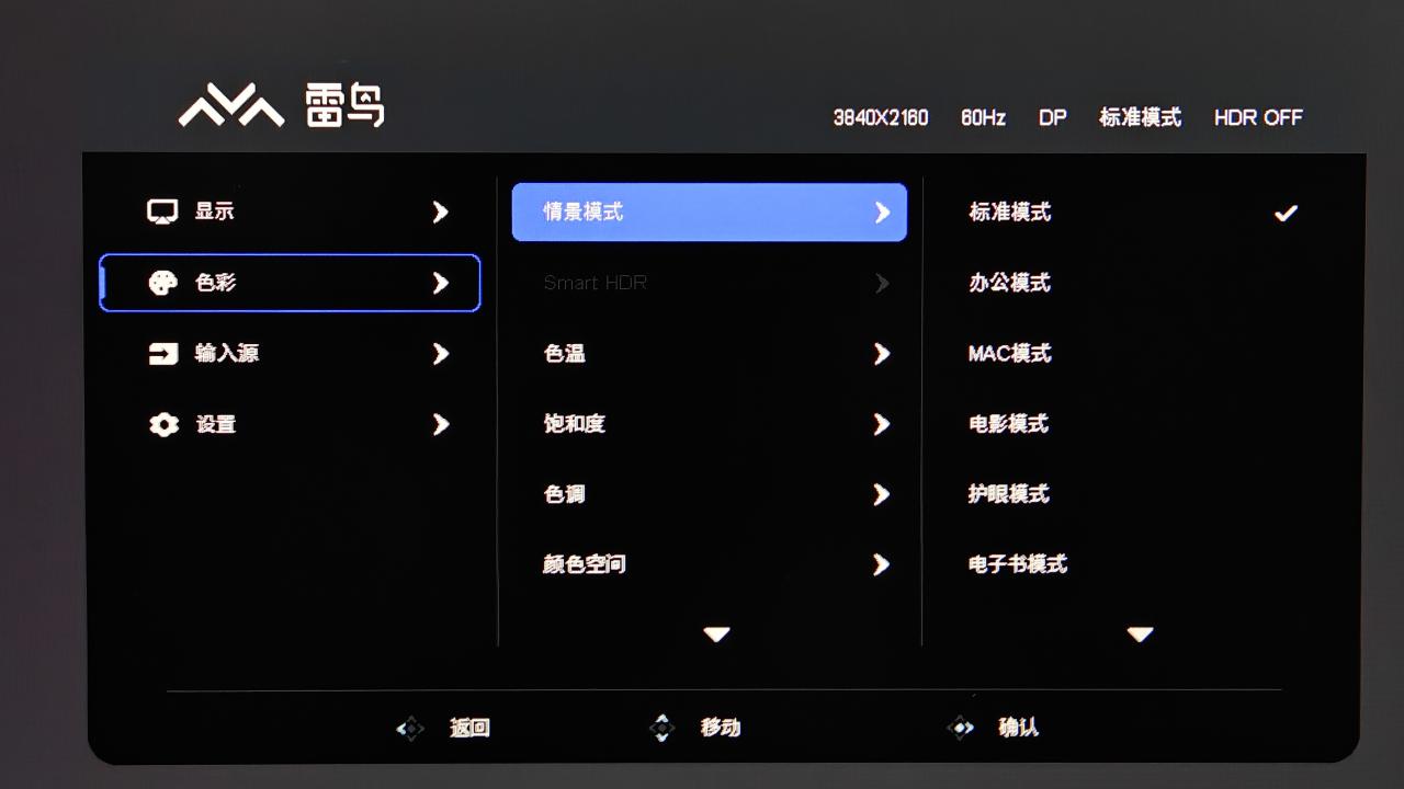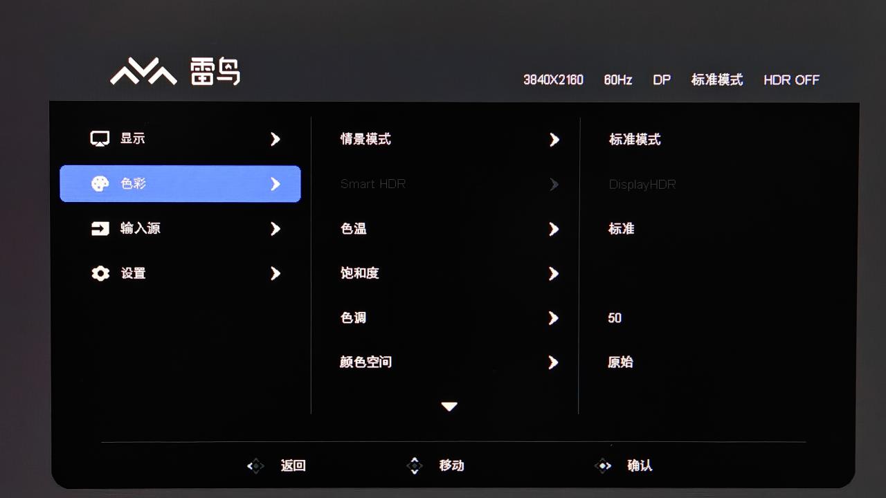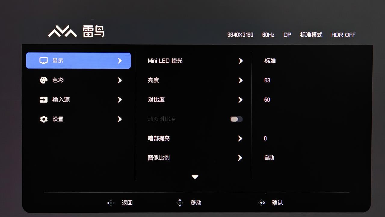 雷鳥U6的osd菜單功能豐富,除了基本的亮度對比度色溫以外,還能調整顯示器的控光:高,中,標準,關閉,四檔可調,以及更多高級功能。