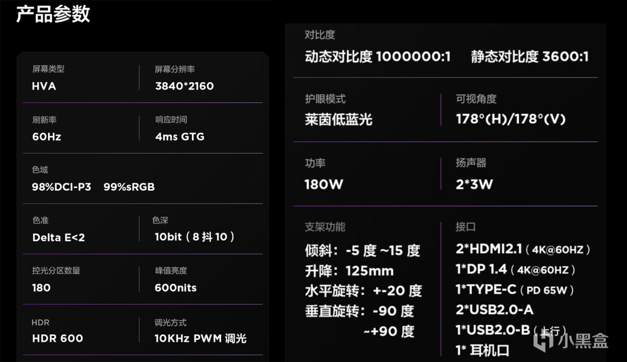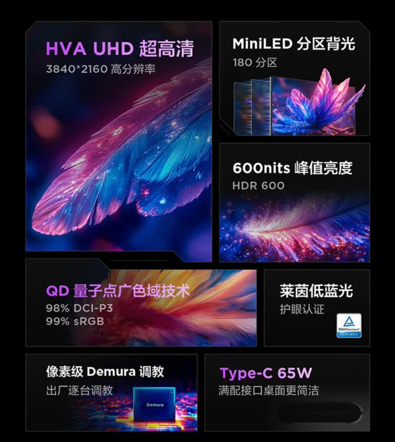 省流:27英寸4K分辨率,180分區miniled+HVA,600尼特峯值亮度,還有65w Type-c反充一線通!