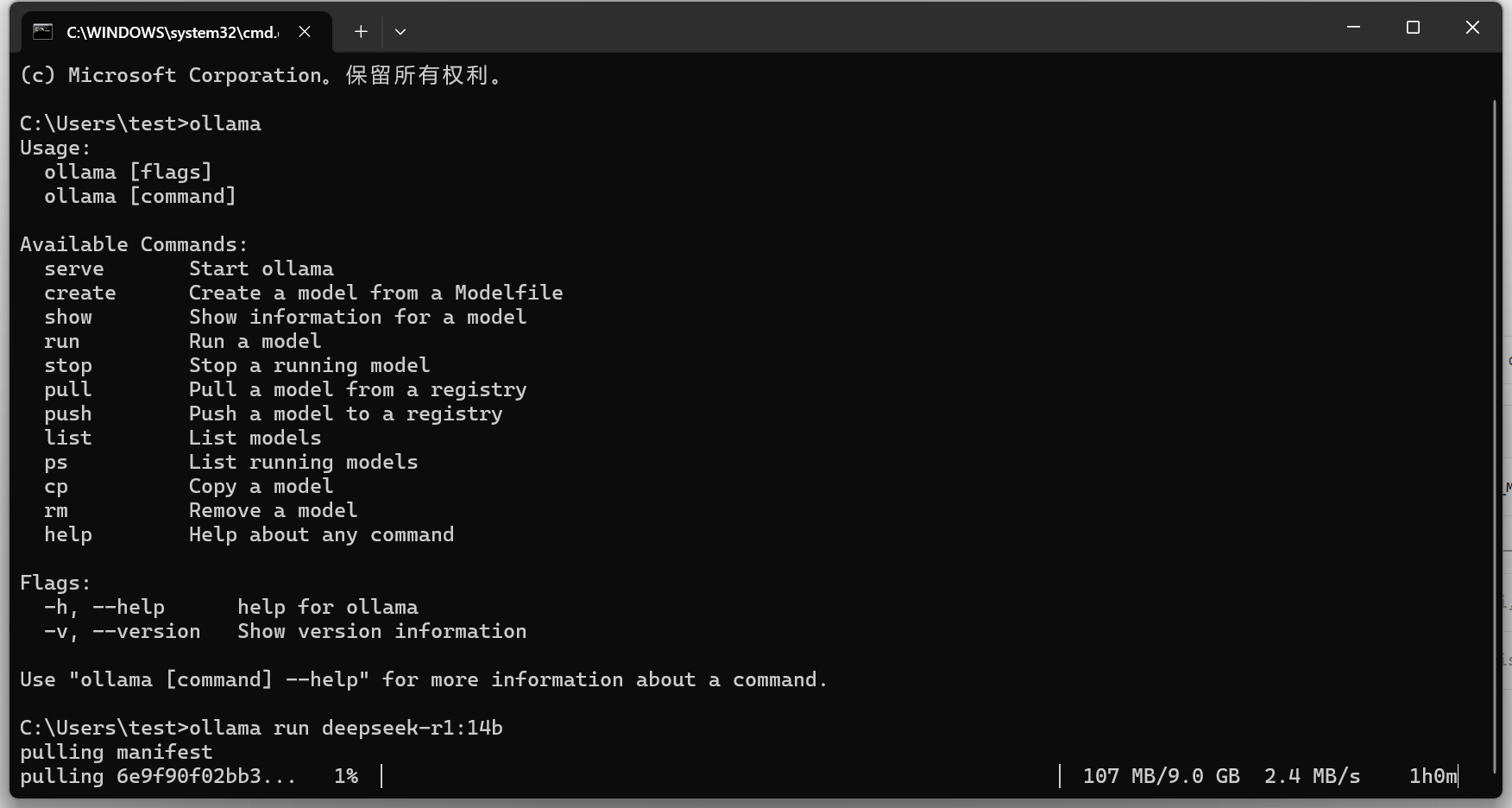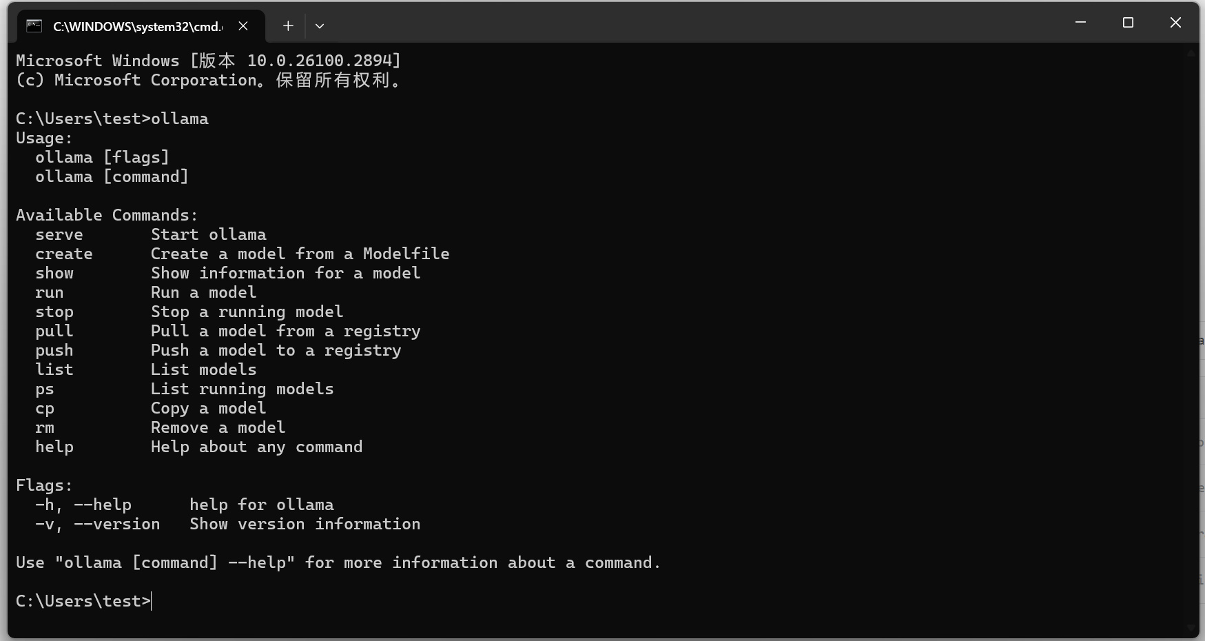 安装完ollama框架后,用win键+R键呼出运行,输入cmd打开命令行窗口,输入ollama,出现命令菜单就是安装成功了。
