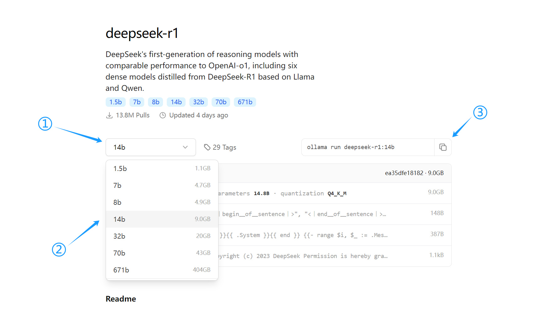 然后回到ollama官网,点击上方搜索栏搜索deepseek-r1,在左边选项框里选择你需要的模型大小,然后点击右边的复制按钮。