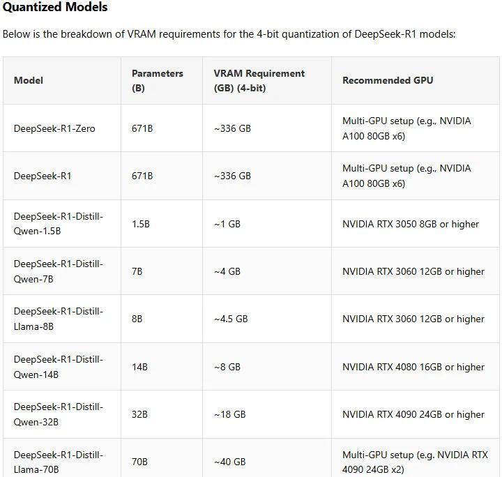 而本地部署除了网络原因外,主要也是有着本地布置私人助手的需求,或者是不想信息泄露,以及在一些没网络的机器上部署,都有着各式各样的原因。而官方原生模型为671B模型,对于显卡显存的需求高达320G以上,正常人基本无法体验,但官方贴心的放出了蒸馏版本,通过量化技术将模型进行压缩,分成了不同需求的版本。