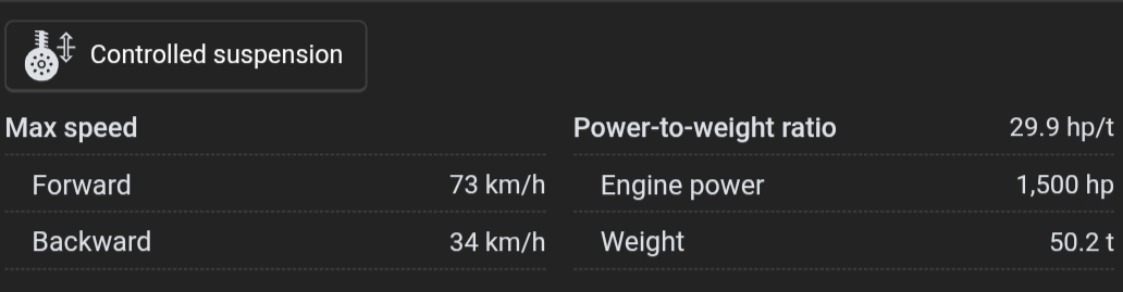 1500馬力的強大10缸二衝程柴油發動機驅動50噸的車體,使她的功重比來到了優秀的30馬力每噸,加速到極速僅用很短的時間。前進後退極速也是一個標準北約MBT該有的水準,稱她是扶桑最優秀的遊騎兵也毫不爲過!