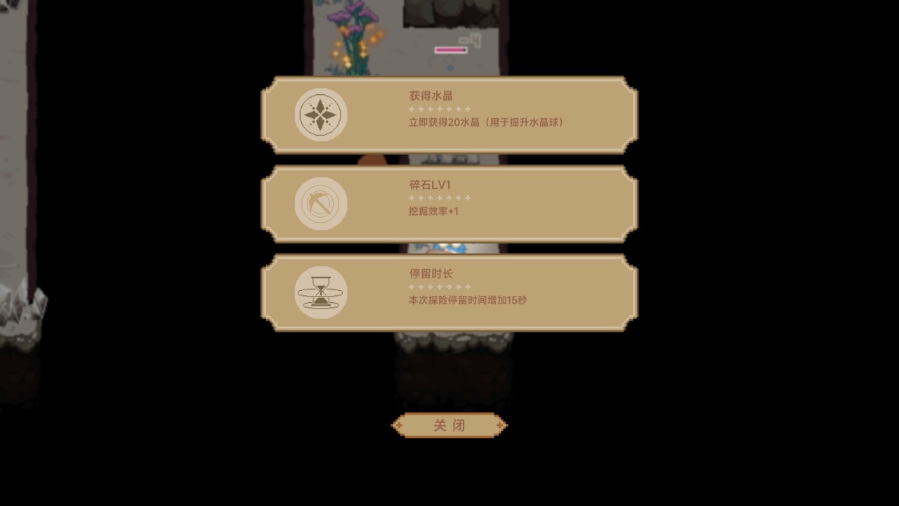 而每一个区域探索完毕,其实并不是把所有的地块挖开就好,而是需要保护水晶,在保护水晶之后才能完全解锁这个区域,游戏的肉鸽模式正是为了保护水晶才制作的。玩家可以在挖掘的过程中发现一些道具可以让你随机选择增幅,比如说停留时长,挖掘效率获得可以提升水晶球的水晶或者是最直接的一些战斗技能。