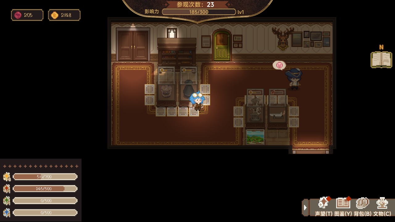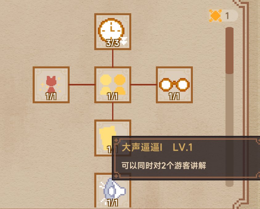游戏的开门经营最核心的点其实在于玩家对游客进行讲解,这部分是连接其他玩法的枢纽之一,你可以通过讲解获得道具,再通过道具升级技能,到后期可以通过这些技能完全实现自动化讲解。而讲解又会获得每一个势力的好感度和藏品的理解程度,对于后续的发展都十分重要。