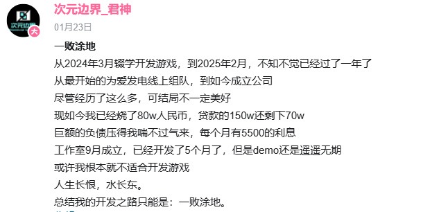 比如前段时间贷款150w制作游戏的君神,如果你稍微了解一点他的情况就能发现,其实最大的问题就出在完全没有规划,给了一个框架之后,任凭成员发展。