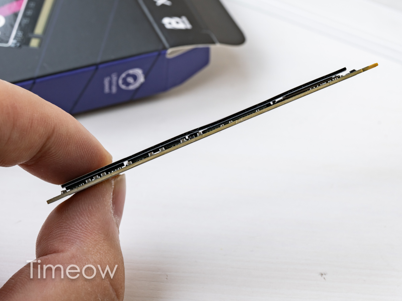 从侧面看,这块石墨烯散热贴确实用料十足。而且我们也能看出,这款PCIe5.0的旗舰固态硬盘,即使搭载了DRAM独立缓存,依旧保持了单面PCB设计,在轻薄设备上的安装兼容性会好一些。