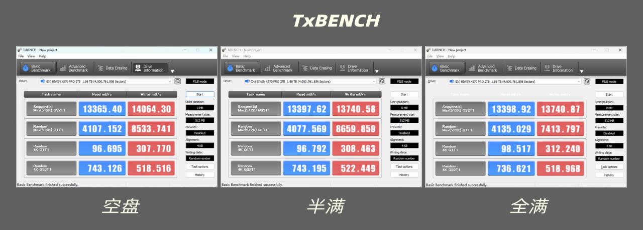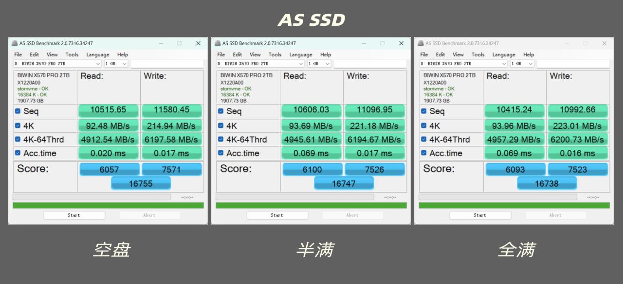 在TxBench和AS SSD测试中,数据也是非常漂亮,三种状态下、佰维X570PRO天启的性能基本一样,表现非常顶级!