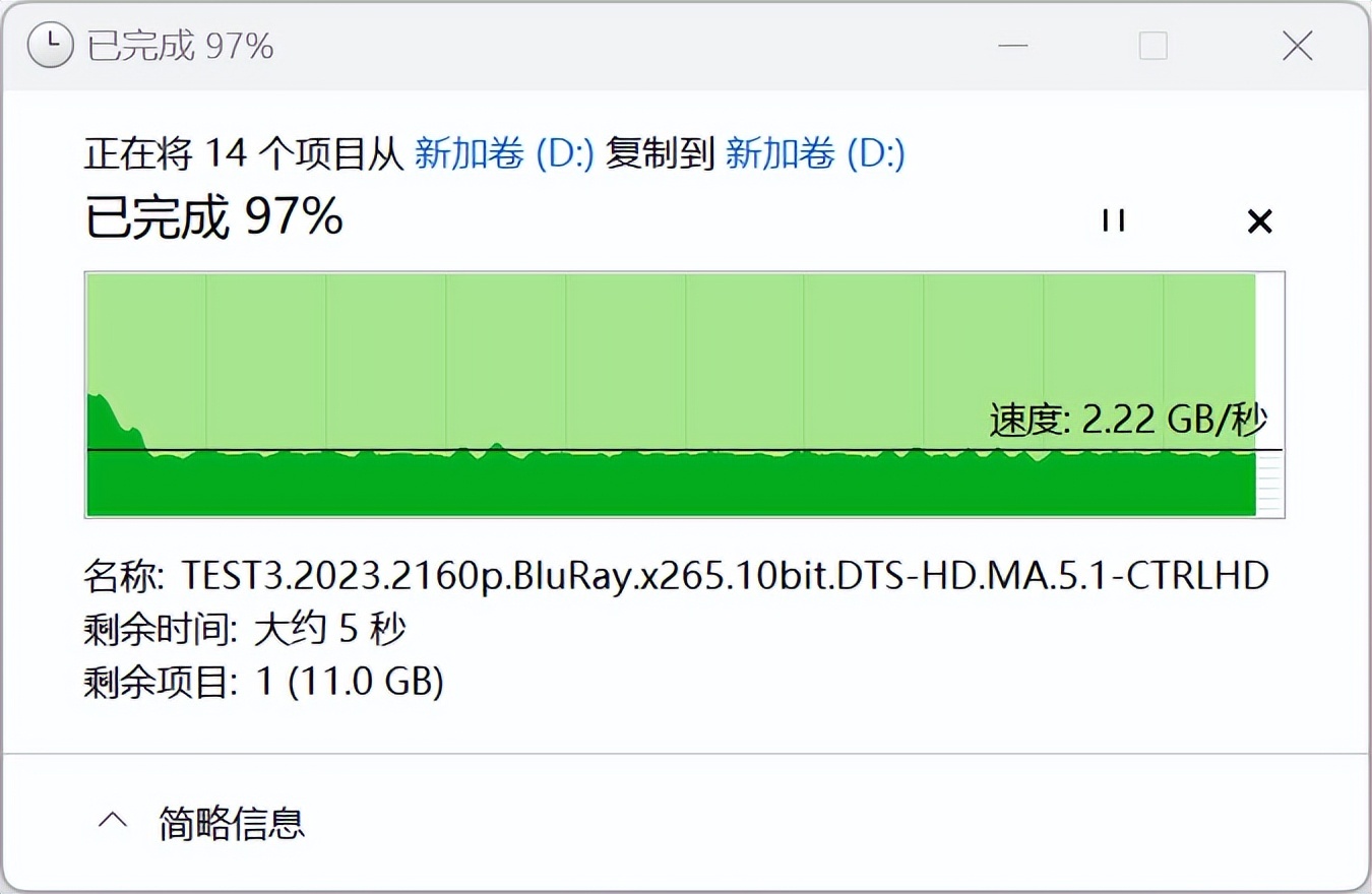 将35G的视频文件,在盘内反复拷贝粘贴,最终可以观察到,在SLC缓存用完后,速度可以保持在2.2GB/s左右,这缓外速度何等强悍啊!几乎达到了PCIe 3.0固态硬盘的缓内写速,太牛了!
