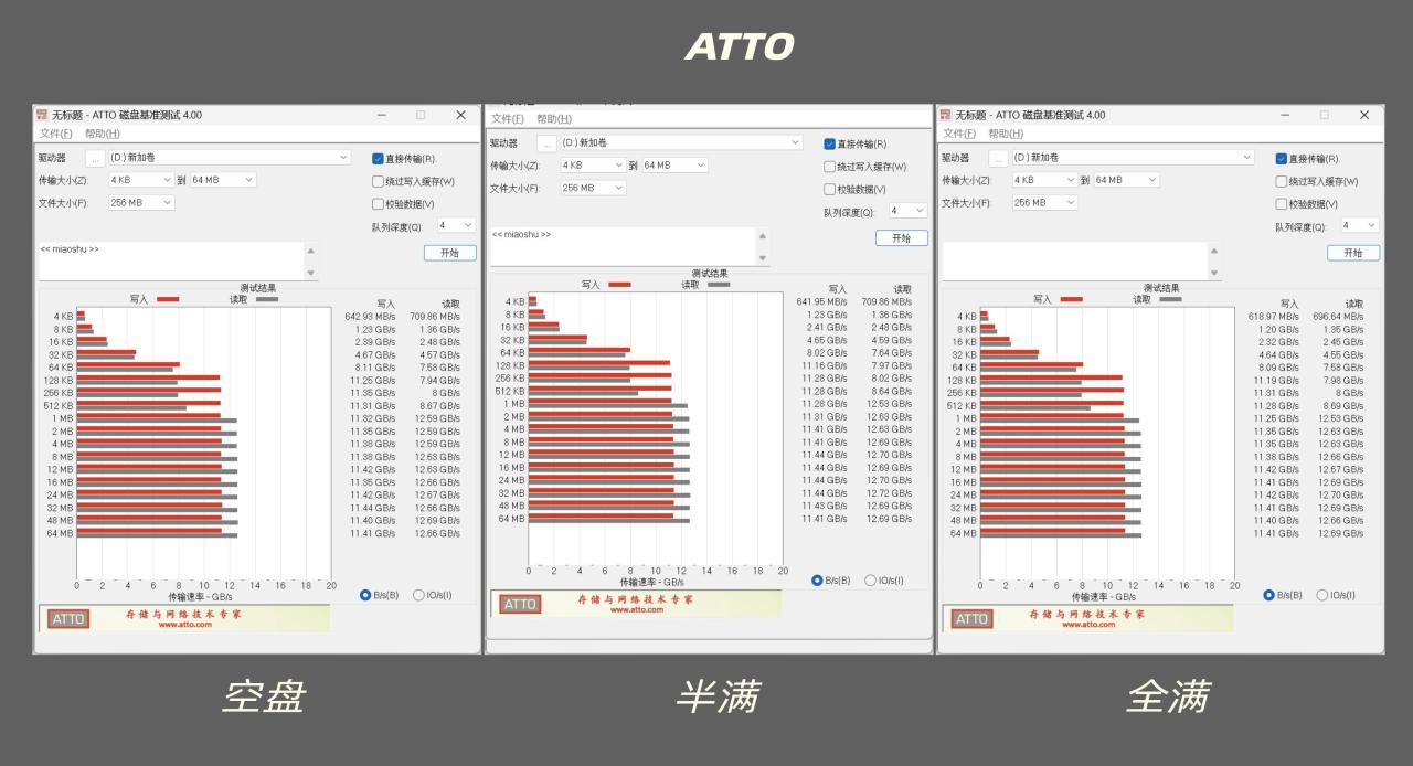 ATTO Disk Benchmark中,我用默认的4KB~64MB多种大小的数据测试包、默认256MB的寻址范围,对佰维X570PRO天启进行了多轮深度测试。