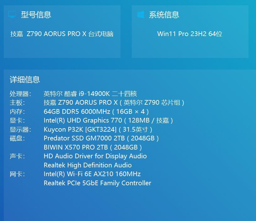 我的电脑核心配置如上,i9-14900K处理器+Z790主板+64GB内存,对佰维X570PRO天启不造成性能瓶颈。