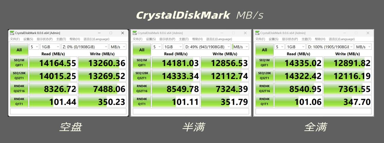 从上图可知,佰维X570PRO天启在空盘状态下的顺序读写性能(SEQ1MQ8T1)达到了14164MB/s和13260MB/s,都超越了官方标称值(14000/13000),在半满和全满的状态下,也仅仅少了一点点,基本可以看做是误差。