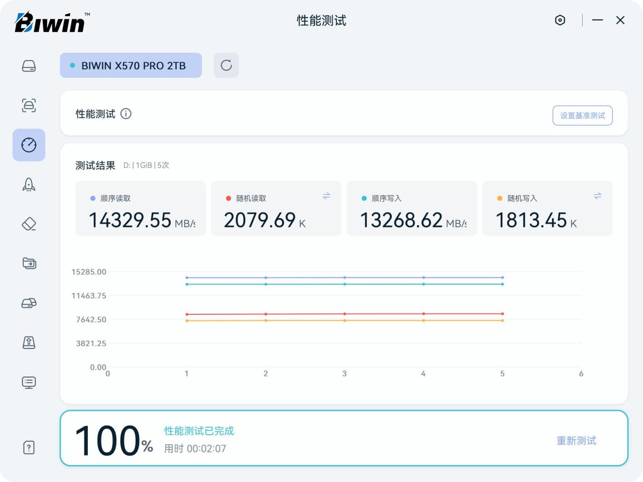 为了直观展现这款满血PCIe 5.0固态硬盘的性能,以下部分的测试中,我会将佰维X570PRO天启的三种状态(空盘、半满、全满)进行对比测试,供大家参考。