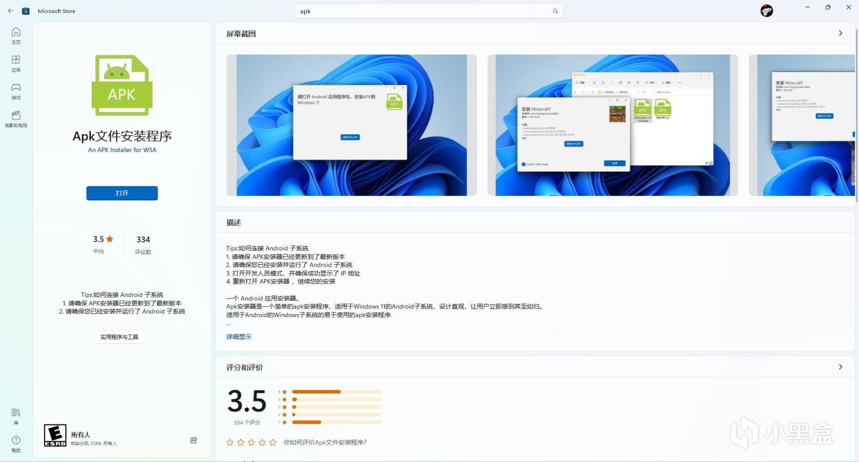 接下来我们下载安装apk的UWP程序,如果前面地区改为了美国,这里应该在应用商店搜索到“Apk File Installer”,如果是用侧载方法安装的子系统,应用商店显示为“Apk文件安装程序”(该软件是不锁区的)。软件商店页面如下图,为了给大家省时间我这边也直接贴出应用商店链接: