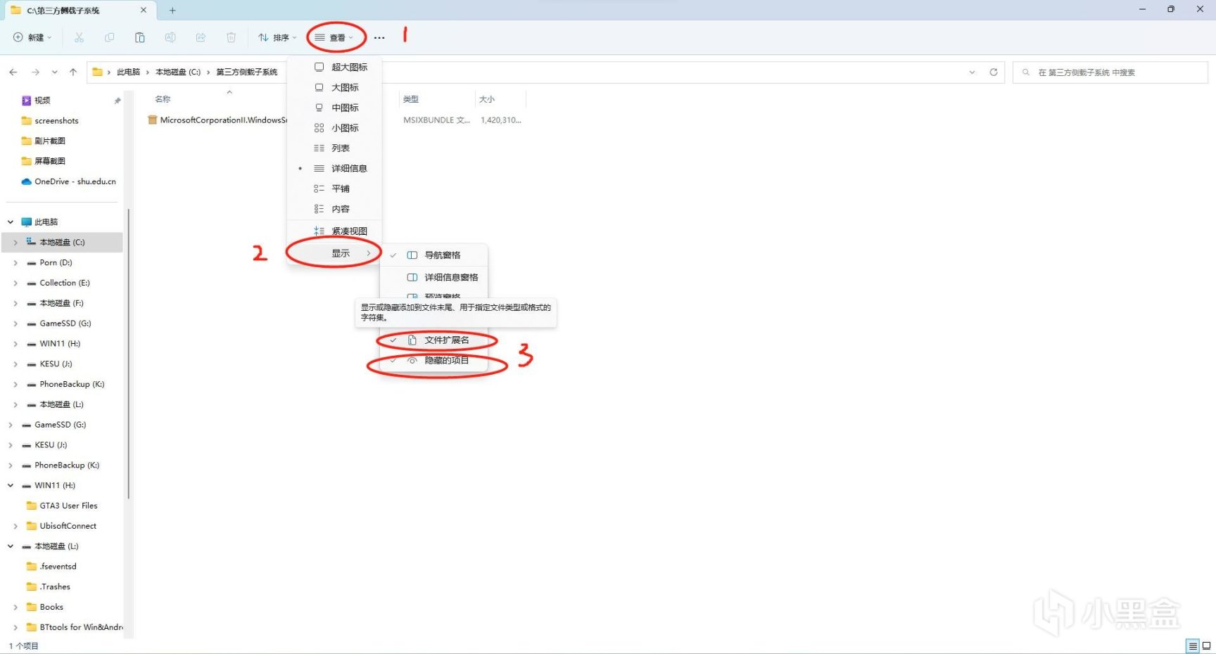 将子系统的微软应用商店地址(https://apps.microsoft.com/store/detail/windows-subsystem-for-android%E2%84%A2-with-amazon-appstore/9P3395VX91NR?hl=en-us&gl=us)复制在图中1的输入框内,点击图中2的√,网站解析后下载后缀为.msixbundle的1.35G的UWP包(大小可能随着更新有变化,总的来说就是容量最大的那个,后缀为.msixbundle不变),下载后如果没有后缀名和下图的图标的话(意味着为未识别文件)右键重命名添加“.msixbundle”(要在文件夹开启扩展名,步骤见下图),重命名后图标会变化,双击安装。