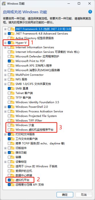 Win+i打开设置或者win+s搜索设置打开win11系统设置,依次点击“应用”→“可选功能”,在可选功能页面底端点击“更多Windows功能”。一般情况下,在更多windows功能中勾选Hyper-V和虚拟机平台(图中1和2)就够了。如果以上两个开启后,之后的环节中子系统仍然无法安装应用,可以尝试来这里打开“Windows沙盒”“Windows虚拟机监控程序平台”(图中3)