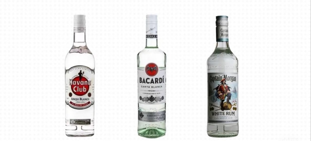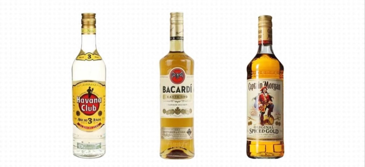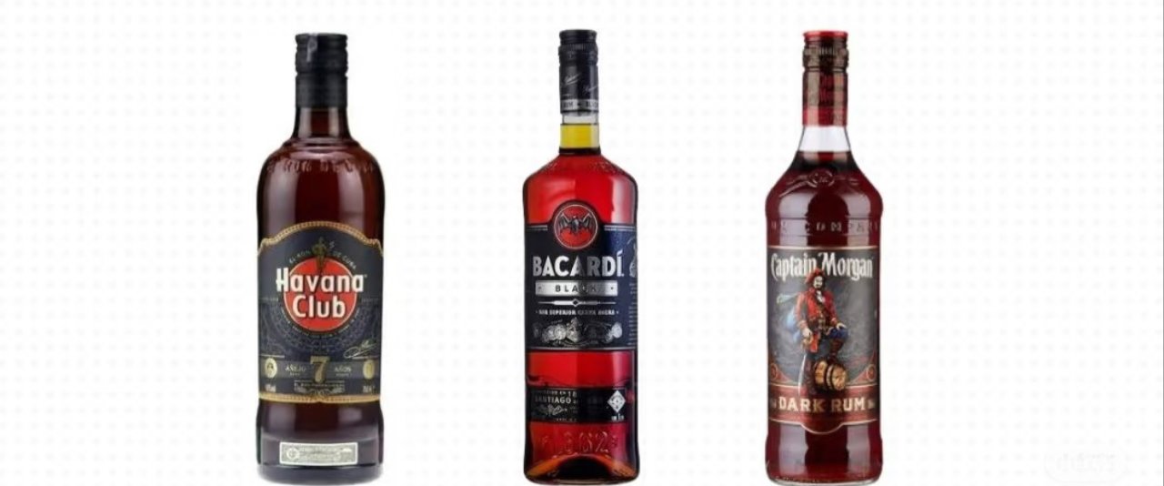 1️⃣工業朗姆:一般採用糖蜜發酵,風味雜,初喝會有點塑料片的味道,產量大價格低是優勢(這裏重點點名百加得)😫,上面的圖片大家可以看到,這一種朗姆咋還有仨顏色呢?別急,先按下不表哈~🤓