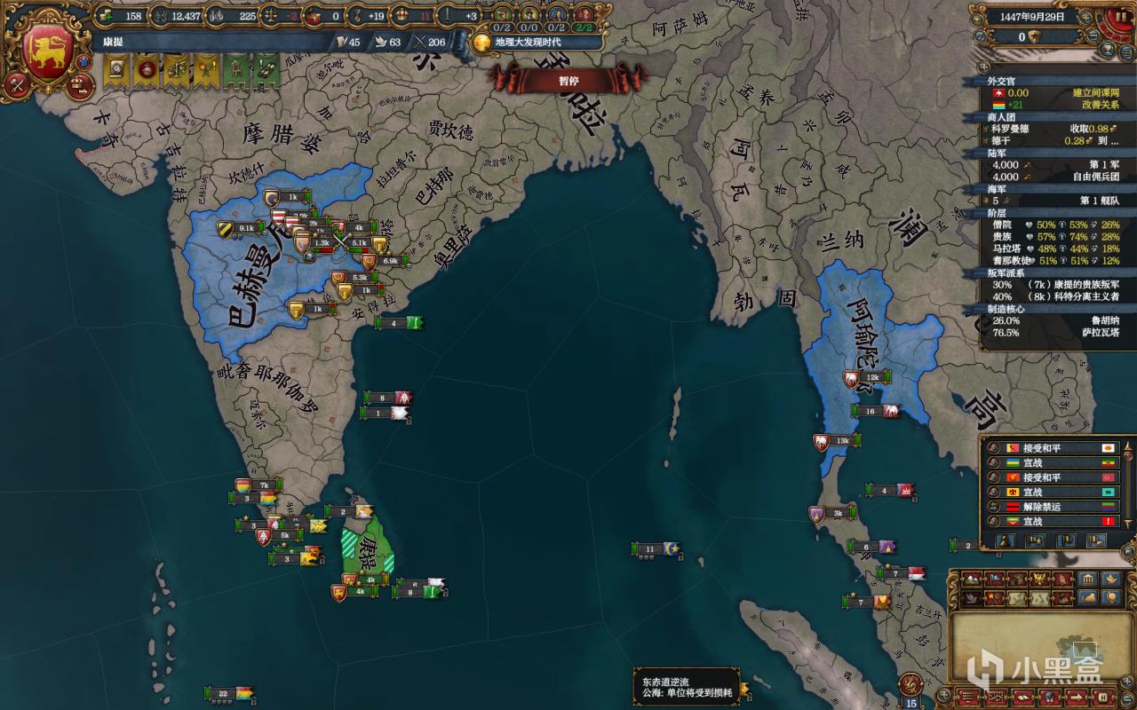 1444年12月11日,拉上自由佣兵团并雇佣将领后,直接向宗主国科特发动独立战争。宣战的同事拉阿育陀耶、巴赫曼尼的关系,并与之达成联姻。巴赫曼尼虽然开局对康提态度冒火,但关系拉满后态度恢复正常,可以联姻。