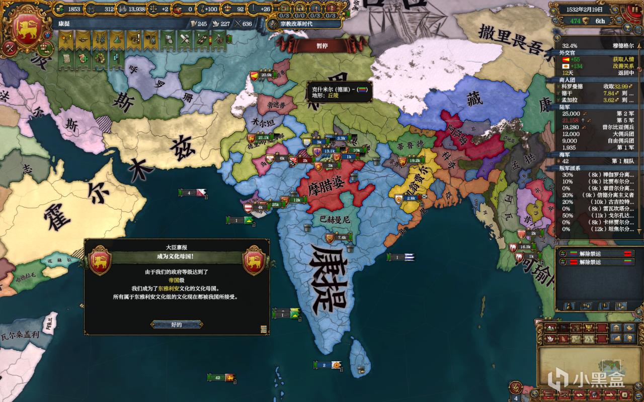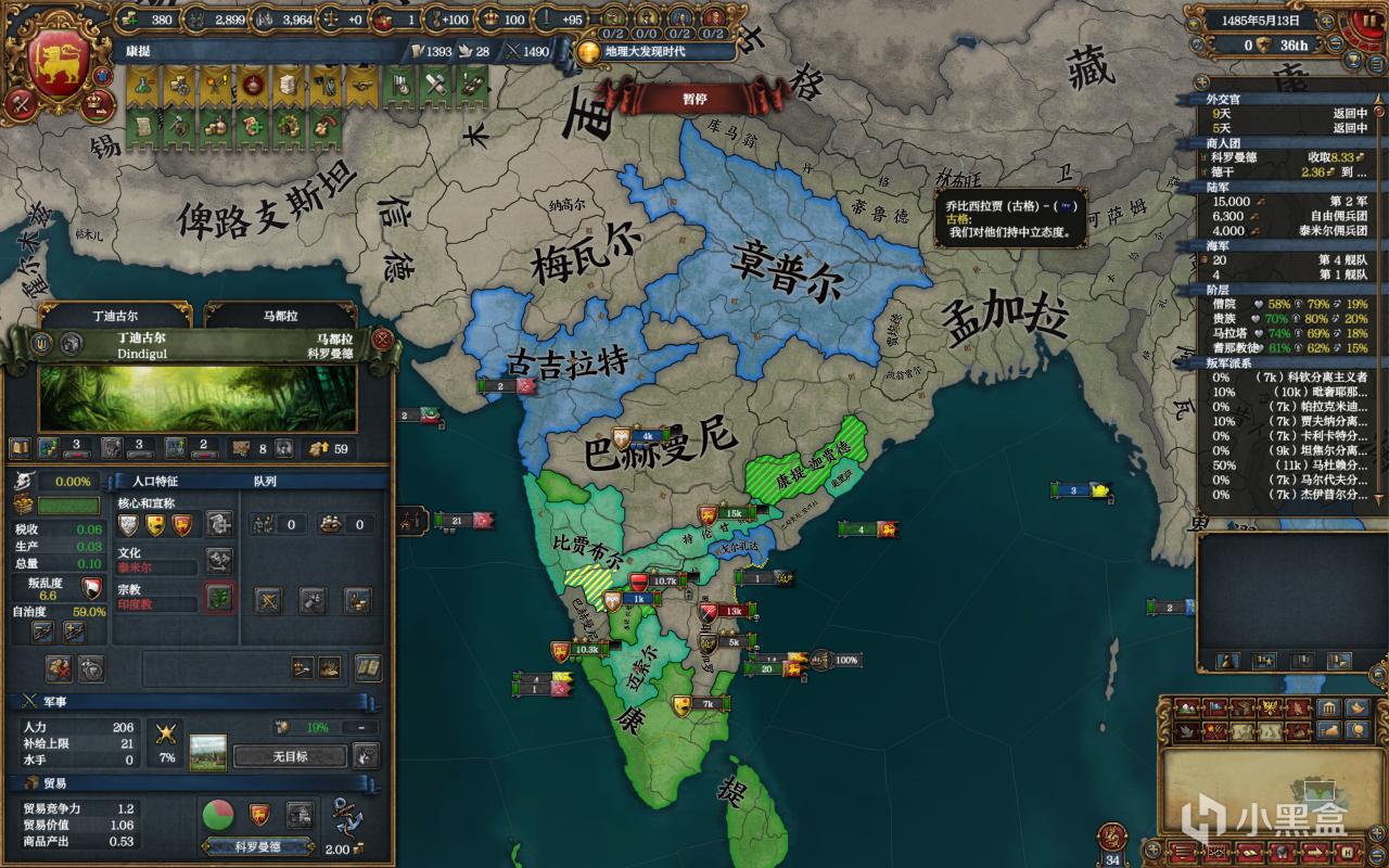思潮方面,毫无疑问文艺复兴、殖民主义、印刷机思潮都要自己种,全球贸易应该会自动获得,不过实际游戏并没有打到1600年。与斯里兰卡隔海峡的坦焦尔地区及北部的南卡纳提克地区是不错的种地省份,一溜沿海农田和草原,产出好,辐射的省份多,可以迁都到这个区域。