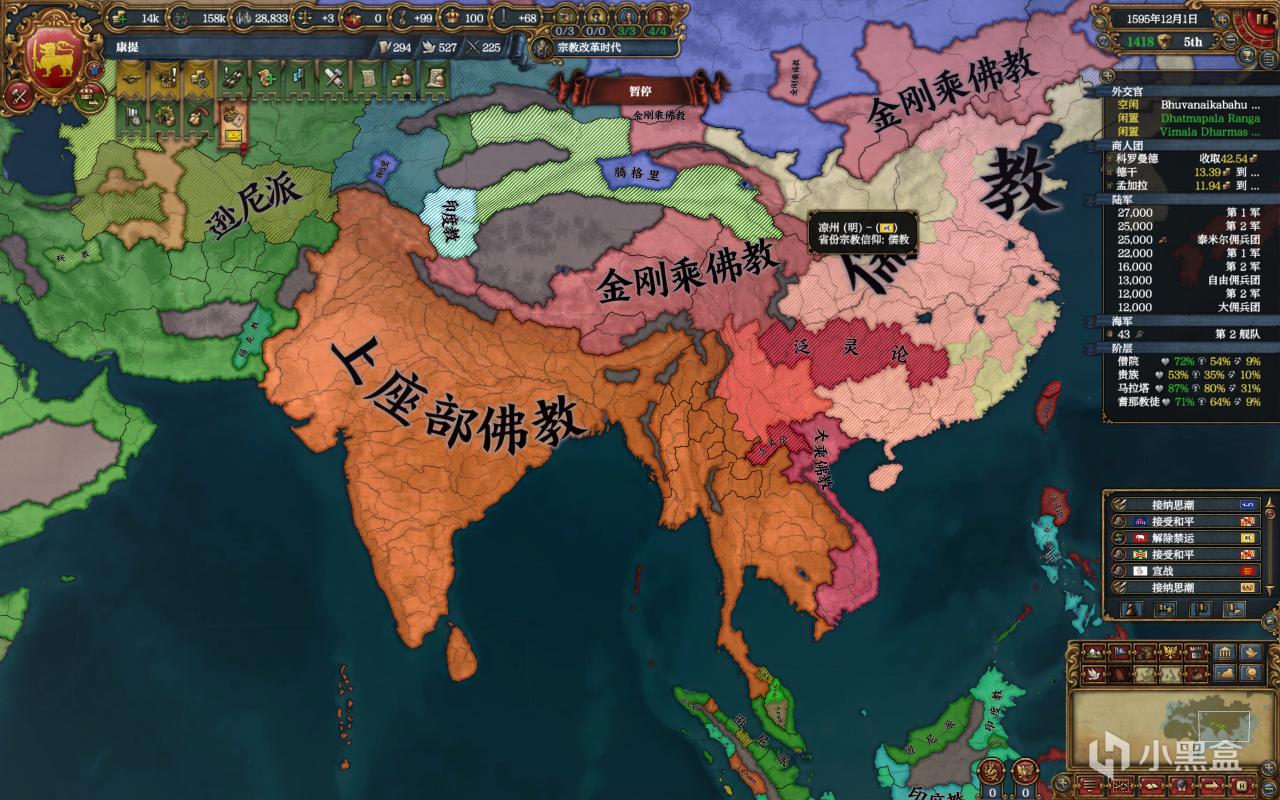 康提属于上座部佛教,有+2异端容忍,-10%顾问花费,后者稍微省点钱,前者对于前期印度教、***教省份完全没用。