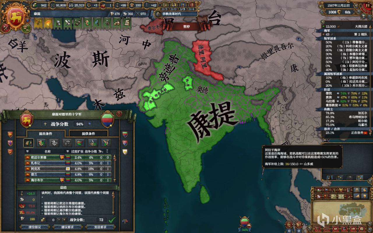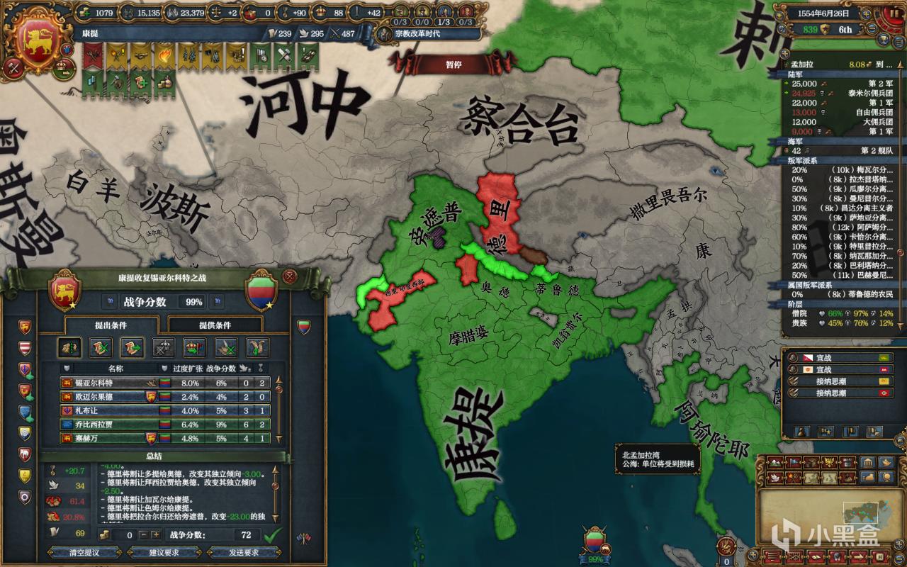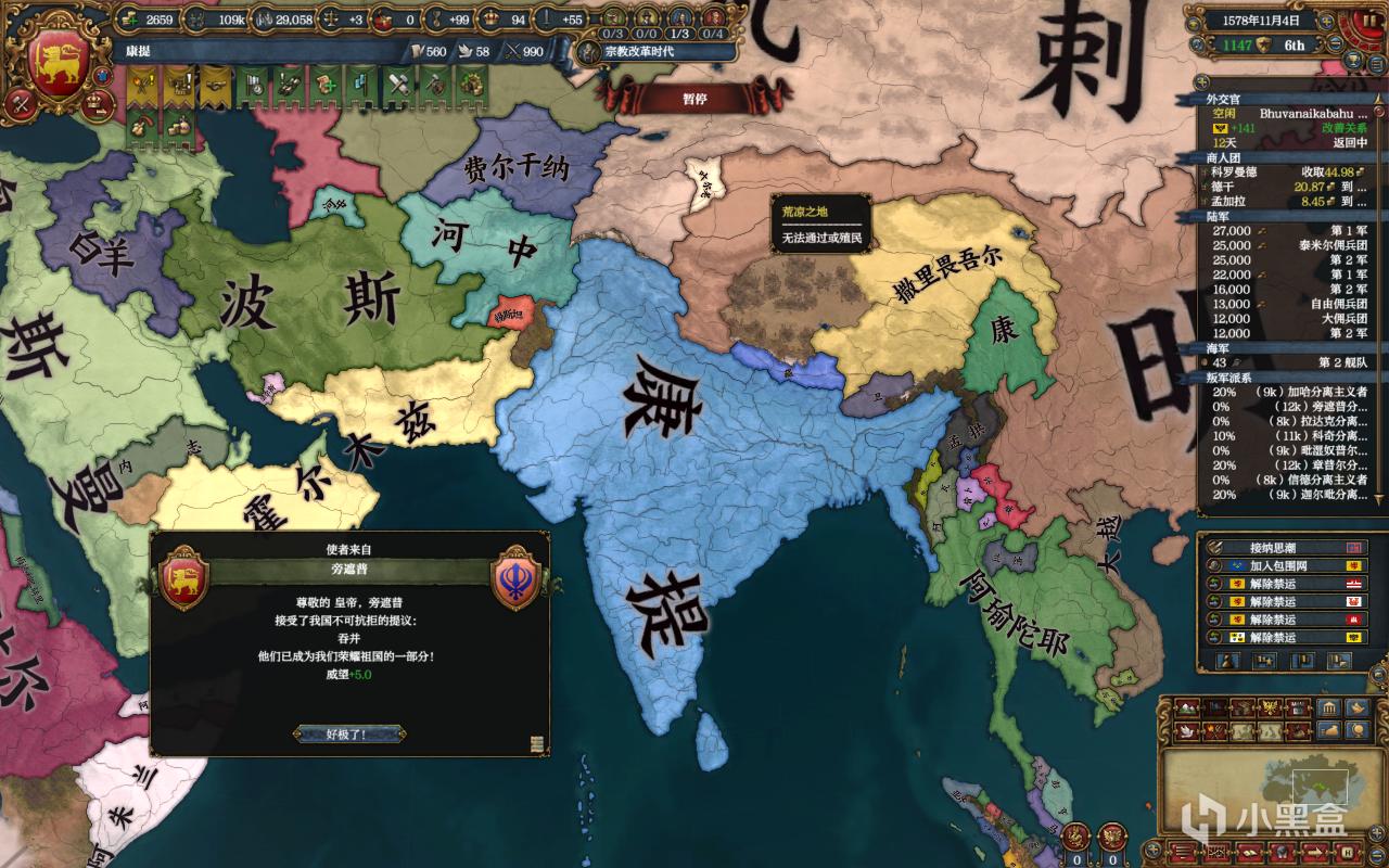 总结:结合康提的扩张需求,在游戏中我们要主动吃地结合释放附庸收核再外交吞并,并积极响应盟友的召唤,保证大部分时间内业力条在-33至33之间。
