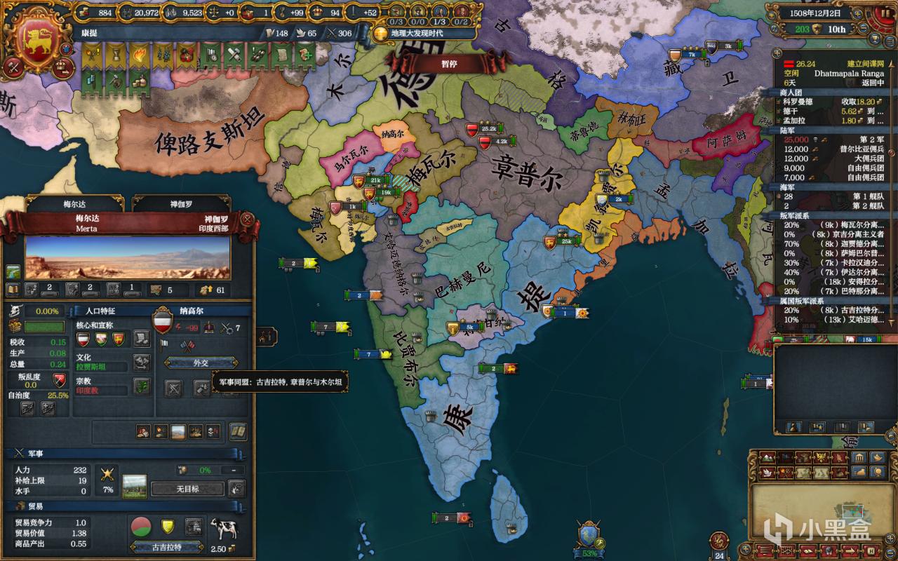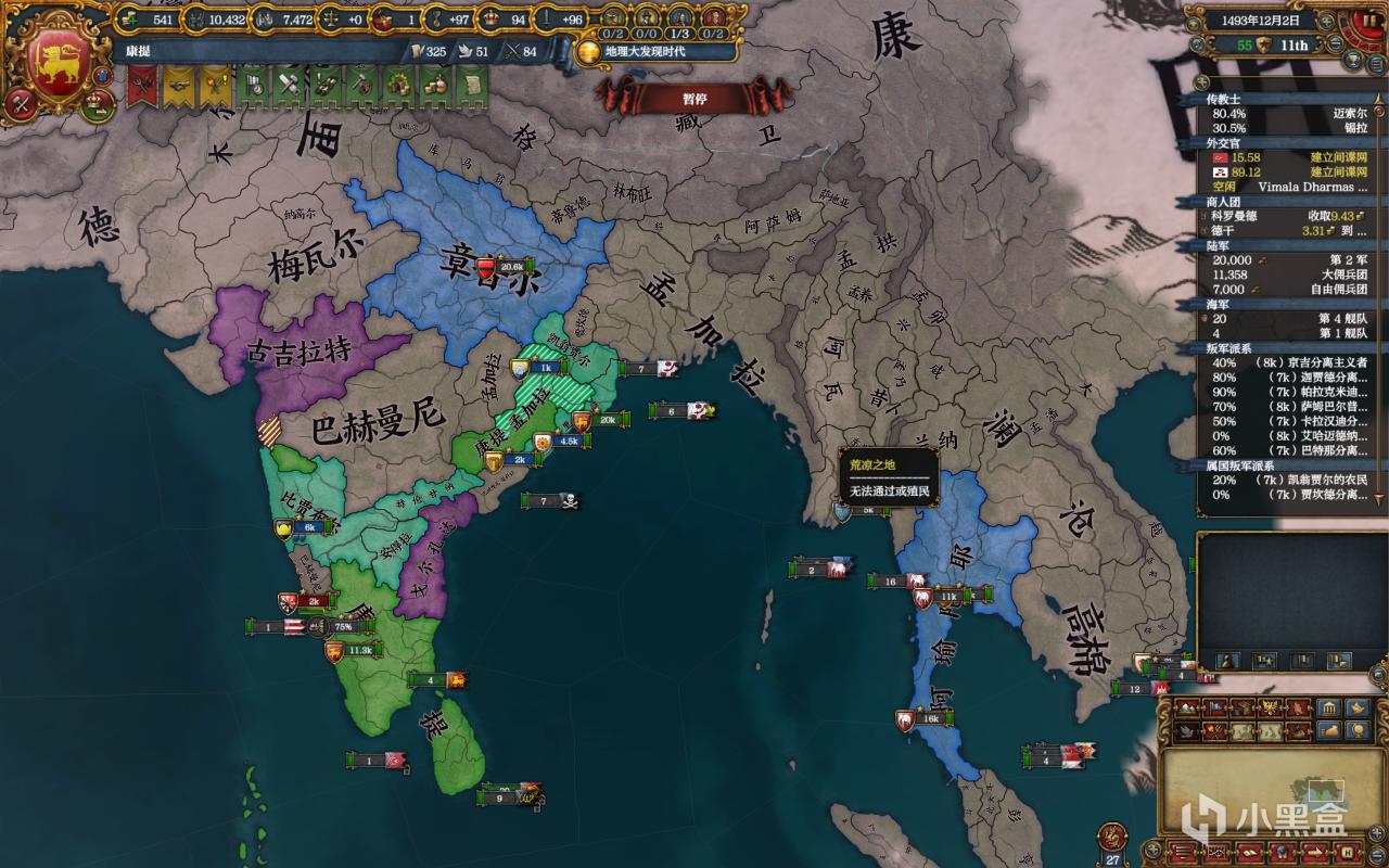 1485年,我们把盟友换成了巴赫曼尼的宿敌古吉拉特和章普尔,已经击败巴赫曼尼,并释放多个附庸收核。下图中比贾布尔、特伦甘纳、奥里萨都是我们新收的附庸,之前的马杜赖、马尔代夫都已外交吞并。