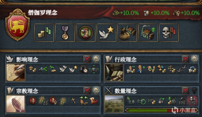 前面提到过,康提自身理念偏贸易和防守,对于要在整个印度快速扩张帮助不大,结合成长阶段的游戏过程,我们着重介绍下佛教徒的业力系统玩法以及理念选择。