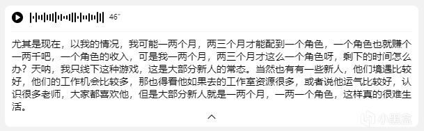 抛开数十万上百万粉丝的那些顶尖CV,很反直觉的一个事实是,中高档国语配音演员(这里定义为能够参与大型二游自机角色的配音)在每个字1~15元的恐怖单价下,依然确确实实面临着收入不足的窘境。