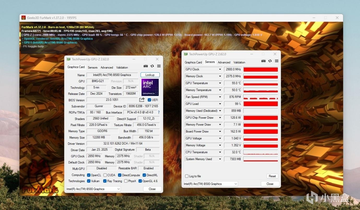 B580擁有20個Xe2核心,5個渲染切片,20個光追單元、160個XXM AI引擎,GPU峯值算力233。核心頻率2670MHz,這裏顯示是2850MHz,這款藍戟B580顯卡出廠已經超頻了,性能更強。顯存位寬192bit,GDDR6顯存容量12GB,整卡功耗190W。