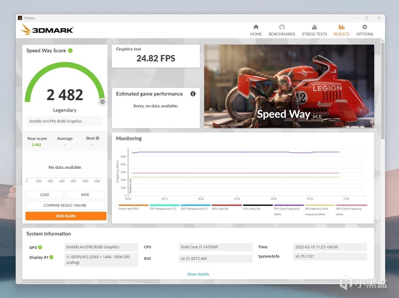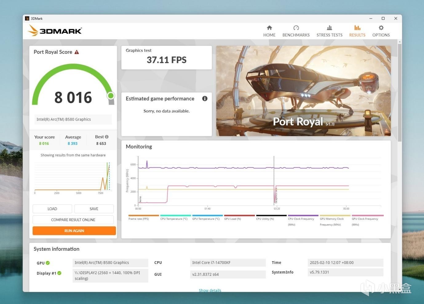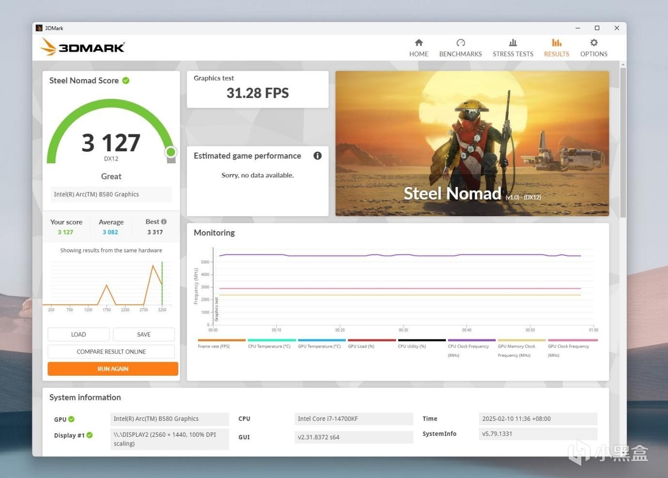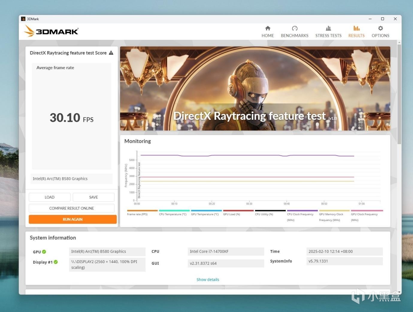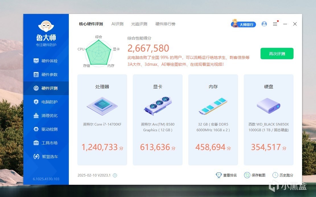 下面我們通過測試,來看看這款顯卡的表現。首先通過魯大師來看看測試電腦的配置,CPU是英特爾i7-14700KF,內存是宏碁DDR5 6800MHz,顯卡識別爲英特爾Arc B580。主板是微星Z790MPOWER,顯示器是攀升Q27S,硬盤是西數WD_BLACK 1TB,還有另外一個硬盤。
