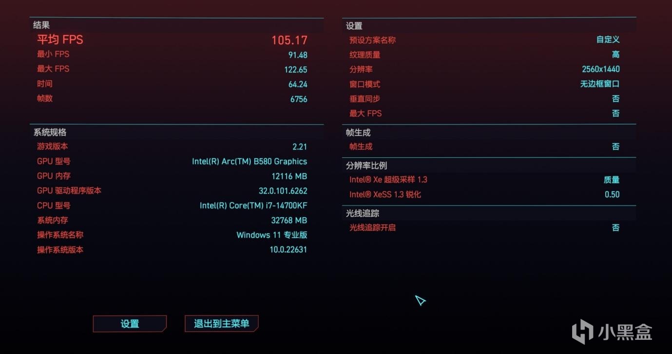 開啓XeSS,質量模式,測試結果是105.17幀,大幅增加。
