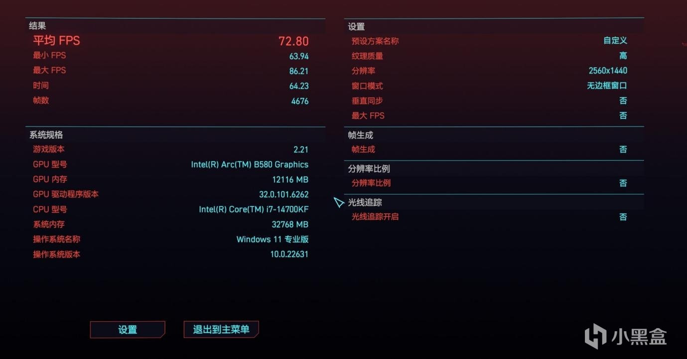 首先是賽博朋克2077,在高畫質下,不開啓XeSS是72.8幀。