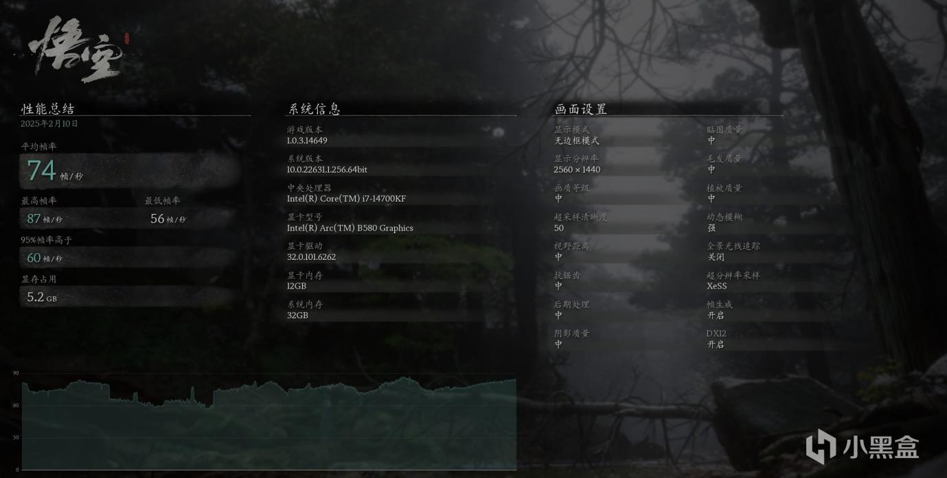 黑神話.悟空,在2K分辨率中等畫質下,開啓XeSS,幀數74幀/秒。