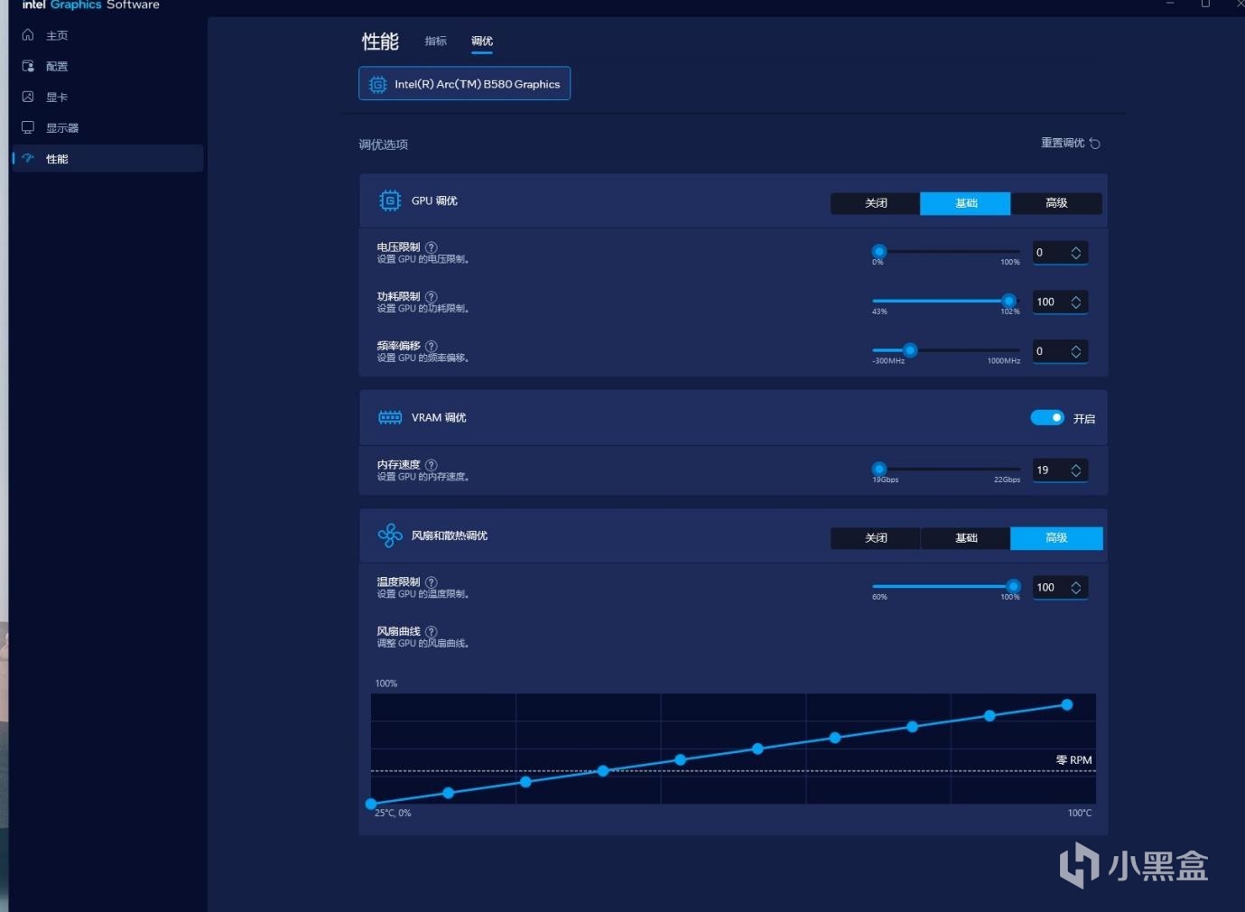 界面設置包括對於顯卡電壓、功耗、頻率、內存速度、風扇曲線的控制,對於超頻愛好者來說可謂是利器。當然超頻有風險,普通用戶還是建議默認就好,畢竟這款藍戟B580默認出廠已經超頻了。
