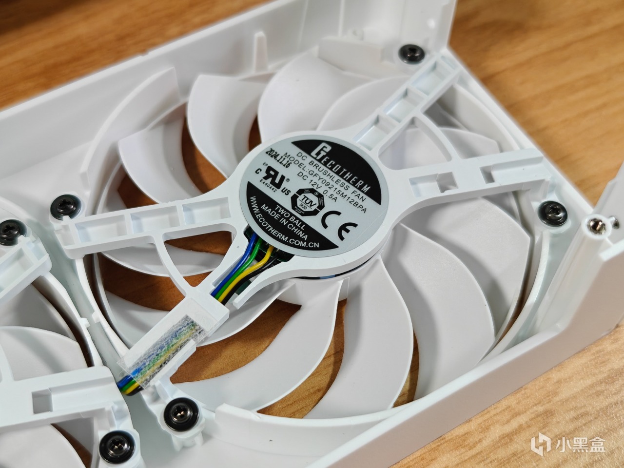 拉近觀看,風扇有11片扇葉,扇葉呈現獨特的彎曲弧線。它是採用了全新設計的,名爲“幽刃”。風壓提升了26%,噪音減少11%,可以實現更加安靜和高效的散熱效果。