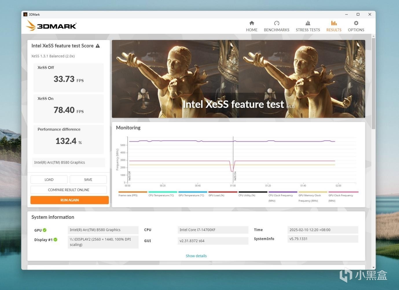 3DMARK XeSS測試,沒有啓用的時候是33.73幀,開啓後可達78.40幀,提升132.4%。