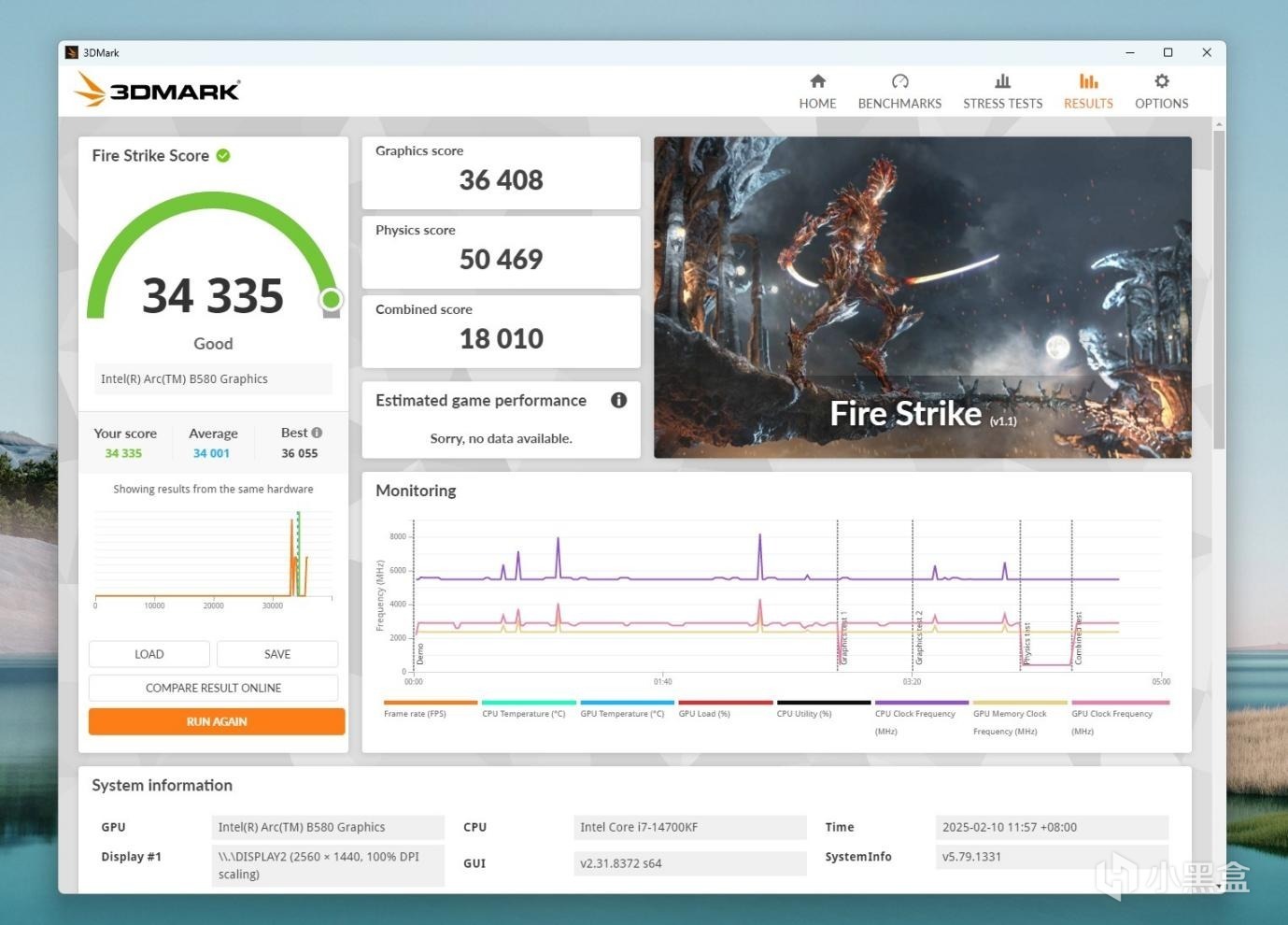 3DMARK Fire Strike測試,總分34335,其中顯卡得分36408。