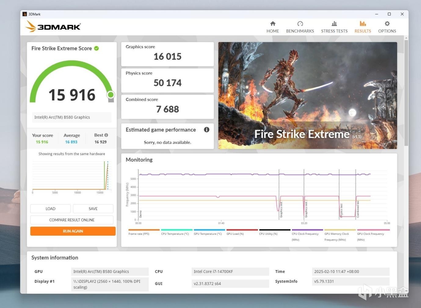 3DMARK Fire Strike Extreme 測試,總分15916分,其中顯卡得分16015。