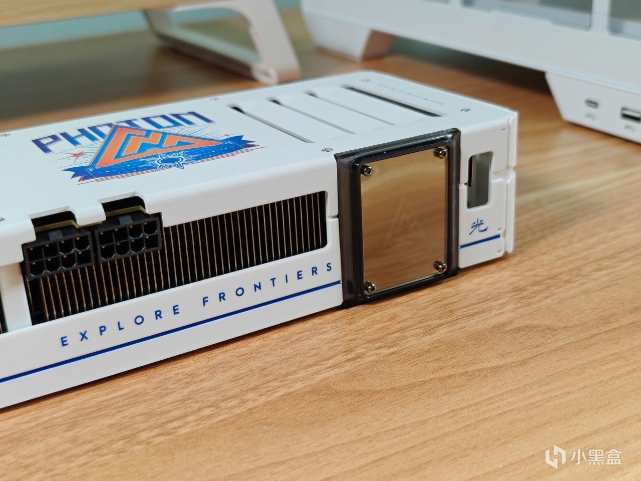 顯卡的背面同樣是白色,採用了鋁合金背板,可以加強架構,提升散熱效果。可以看到背板的右側有鏤空設計,可增強散熱效果。同時上面有獨特的設計彩色文字和圖案。左側有EXPLORE FRONTIERS,右側則是彩色圖標。