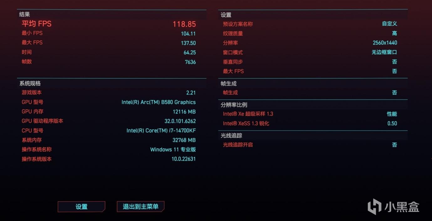 開啓XeSS,性能模式,測試結果是118.85幀,又有所增加。所以在開啓XeSS後,暢玩是沒有問題的。值得說明的是,這個測試的XeSS還不是2代。
