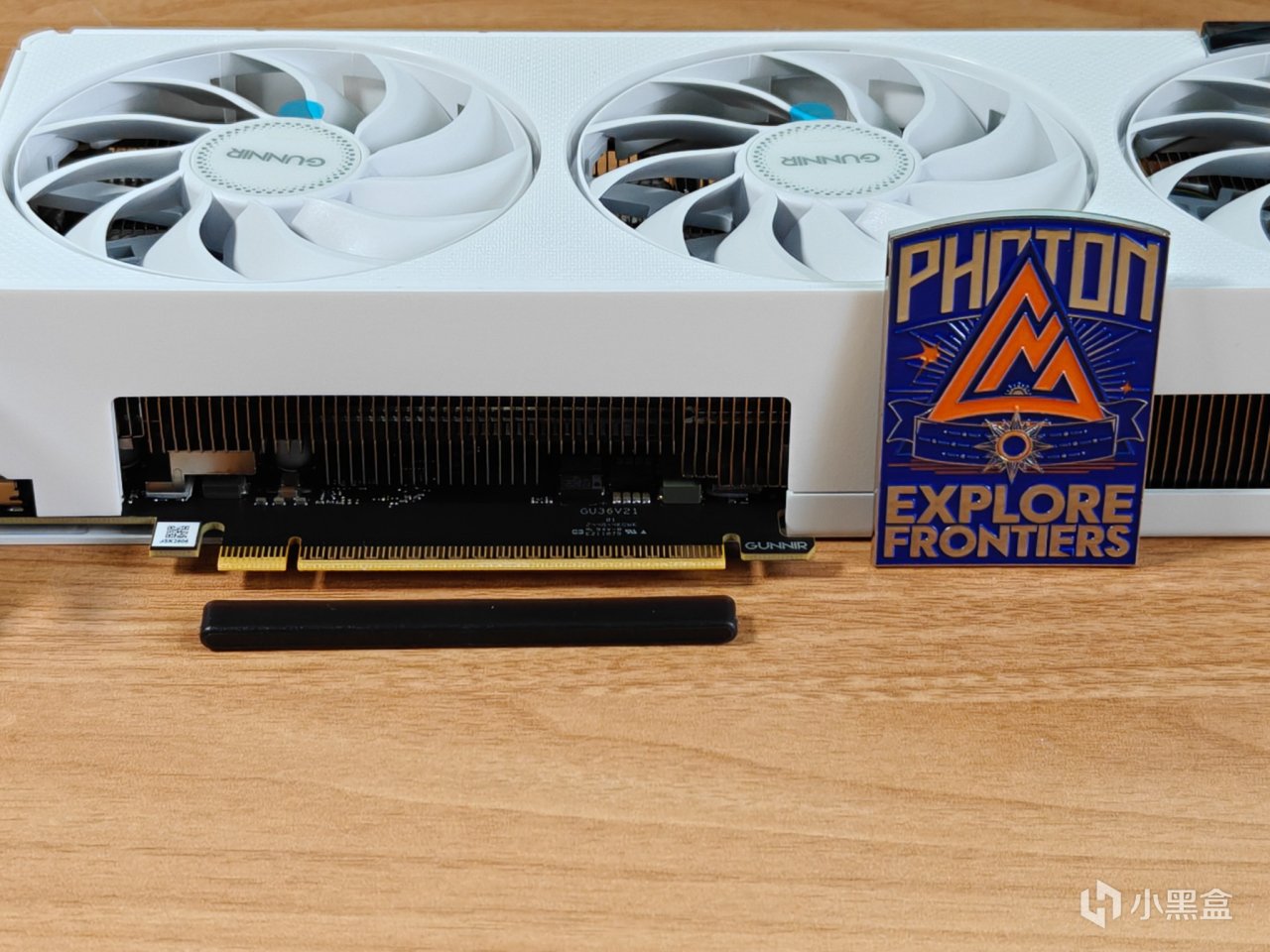 接口有4個,其中一個HDMI2.1a、三個DP2.1,中間的DP2.1接口支持UHBR13.5,帶寬達到54Gbps,其餘2個自持UHBR10。側面擋板上的散熱孔也設計有GUNNIR的字母標記,富有藝術特色。