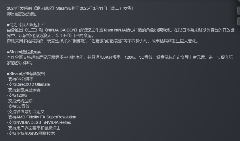 前面也已经说过了,因为浪人崛起在主机端已经有了。很长时间的更新,而且内容一直都做的很不错,这一回上架steam还提供了很多新的内容,包括支持8K 分辨率、120FPS、光线追踪和超宽显示器兼容性,以及完全可定制的控件、UI升级和改进的3D音频。