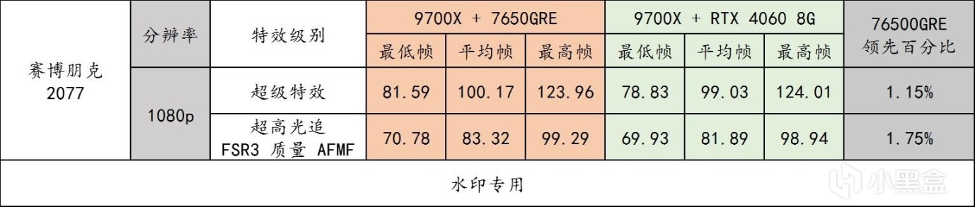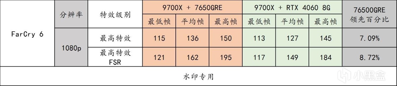 開啓 FSR 後,7650GRE 領先 RTX 4060 1.94% 的幅度,幅度有所擴大。