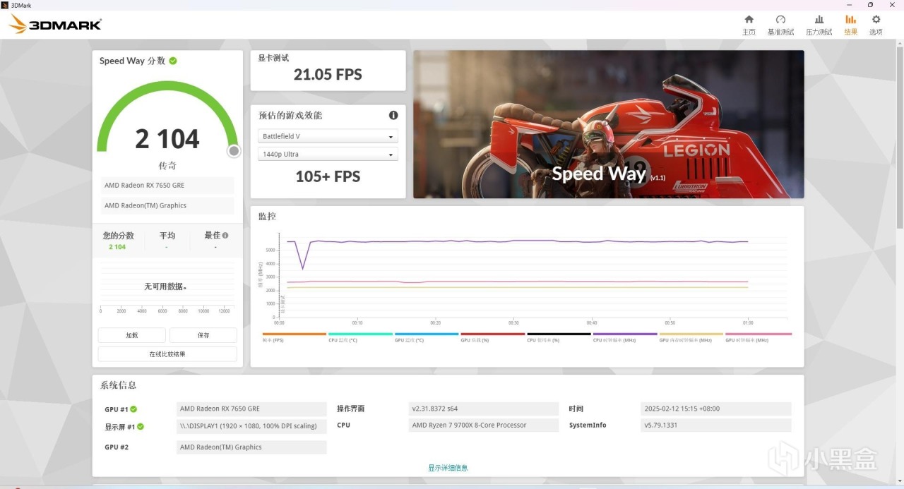 ▲ 9700X + 7650GRE 的 3Dmark Speed Way 性能測試,這表明 9700X + 7650GRE 的 DX12.1 綜合遊戲性能非常不錯,非常適合主打 1080P 分辨率的用戶使用,可以說是 GTX1060 的上位替代。