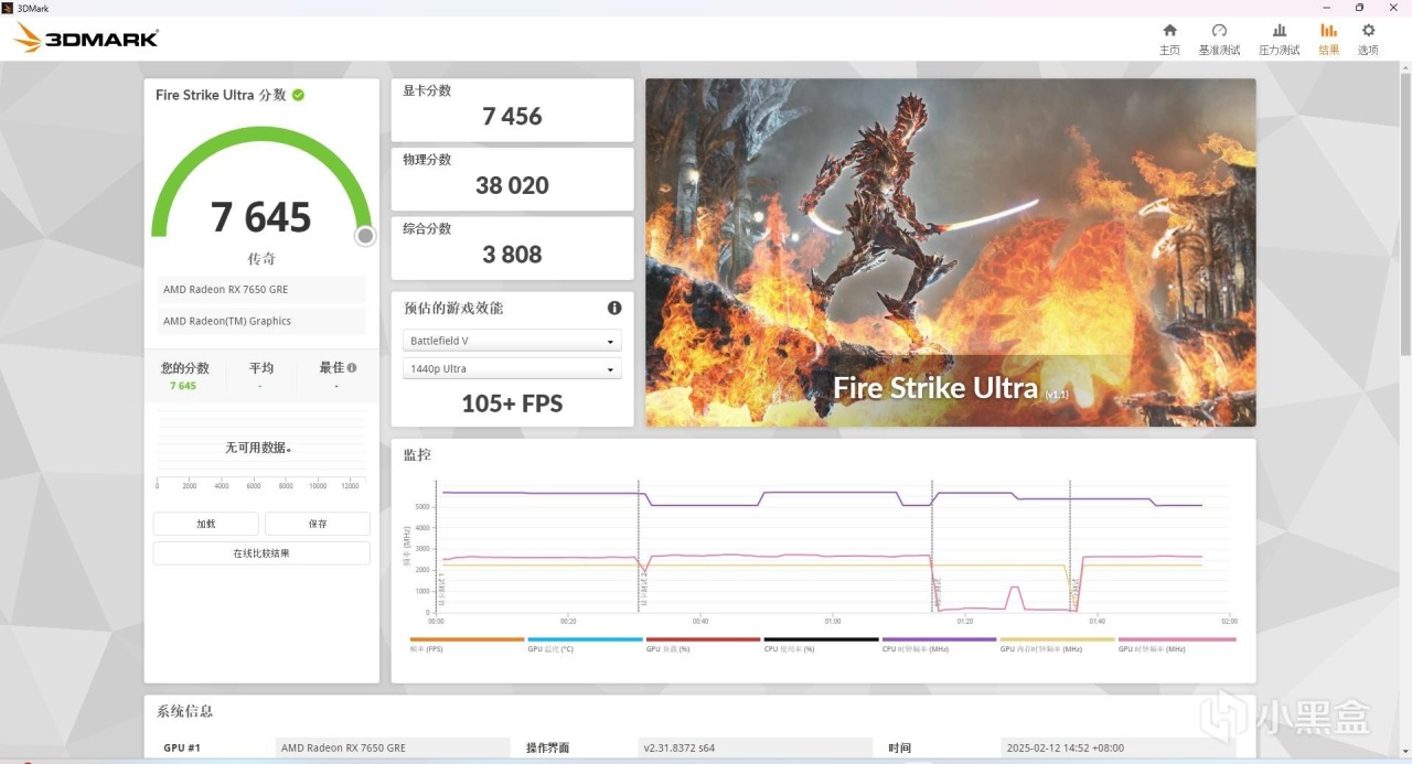 ▲ 9700X + 7650GRE 的 3Dmark Fire Strike 系列測試成績。可以看到 7650GRE 這張卡更適合 1080P 分辨率。