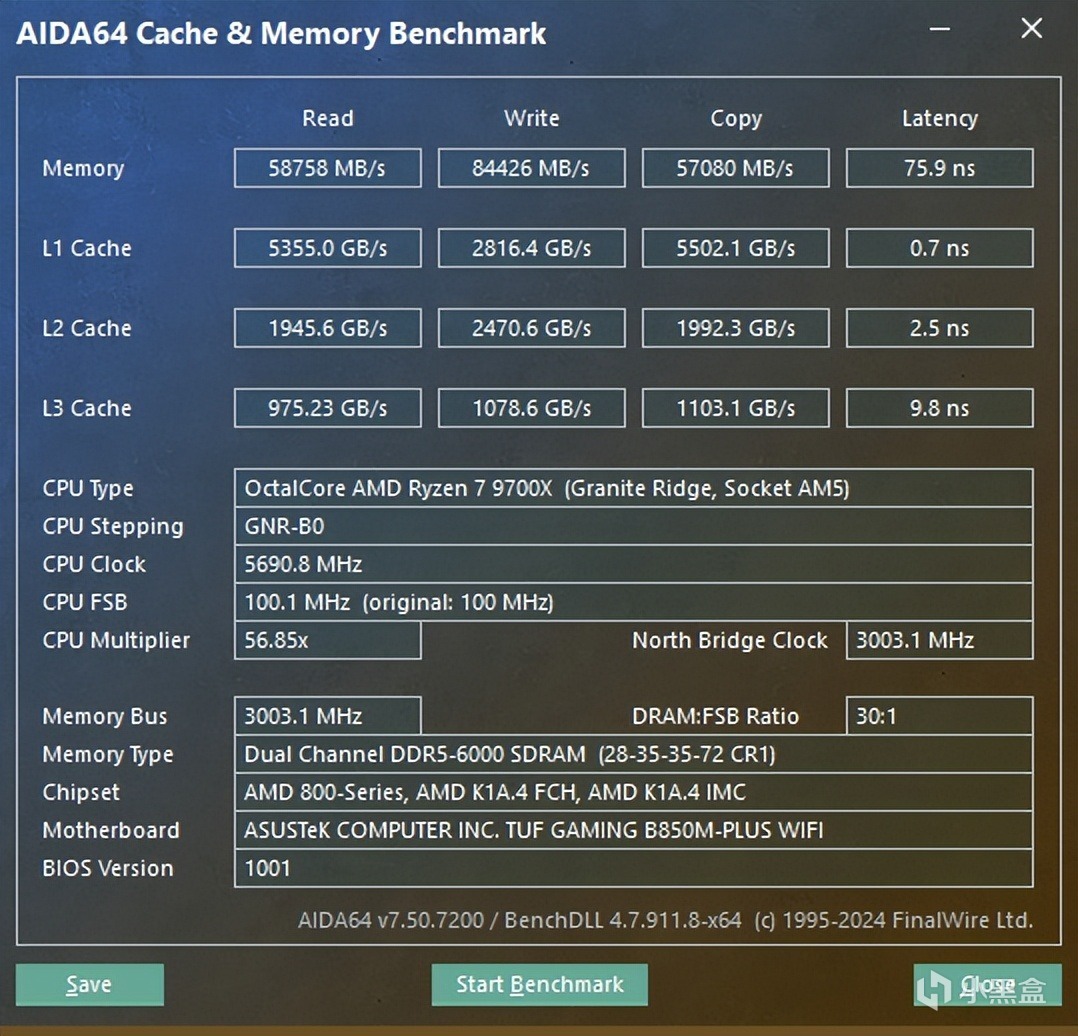 ▲ 9700X 搭配宏碁掠奪者 DDR5 6000 16G*2 C28 的 aida64 內存與緩存性能測試。9700X 爲代表的銳龍 9000 系列十分適合 DDR5 6000 這一頻率搭配低延遲內存,可以讓整機性能更加強悍的同時,也擁有超級穩定的性能。